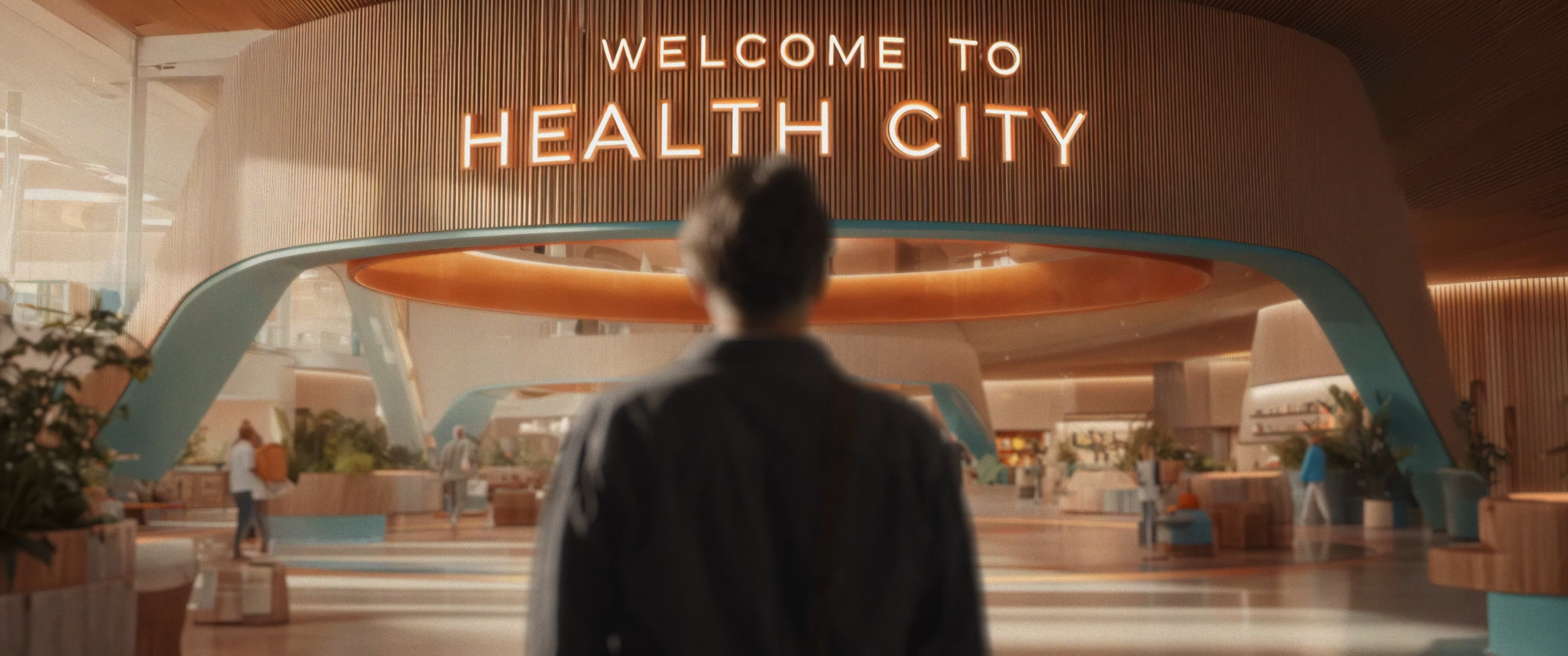 “Welcome to Health City” visualizes a near-future city where energy, mobility, administration, and healthcare are seamlessly connected. The story follows "Herr Träumer" as he escapes everyday bureaucracy and steps into a digital vision of tomorrow—guided by a humorous service robot inspired by Elvis Presley.